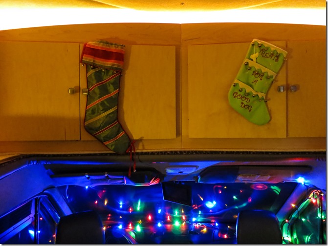 I discovered that the door latches on the front storage doors make great stocking holders for Mille’s and my stockings!