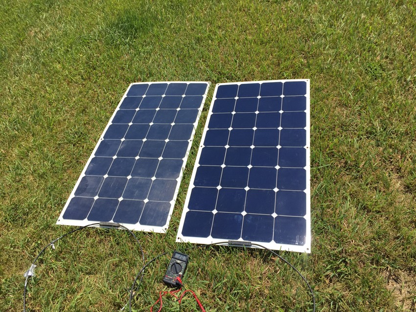 I still had one unused bendable panel in my cargo bay, so it was easy to test each rooftop panel against a “norm.” The rooftop panels (one on the left) showed some graying of its top plastic cover after a year, but the biggest culprit was that they no longer generated any amps or maintained a consistent voltage (readings on the failed panels would vary wildly from 5 to 11 volts in full sun, whereas the unused panel generated 20 volts consistently).
